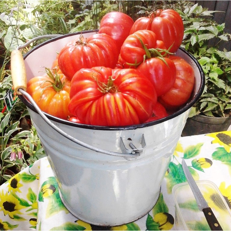 Крупноплодные, розовые ребристые помидоры превосходного вкуса. Высокоурожайные. Масса плодов 300 - 500 грамм.